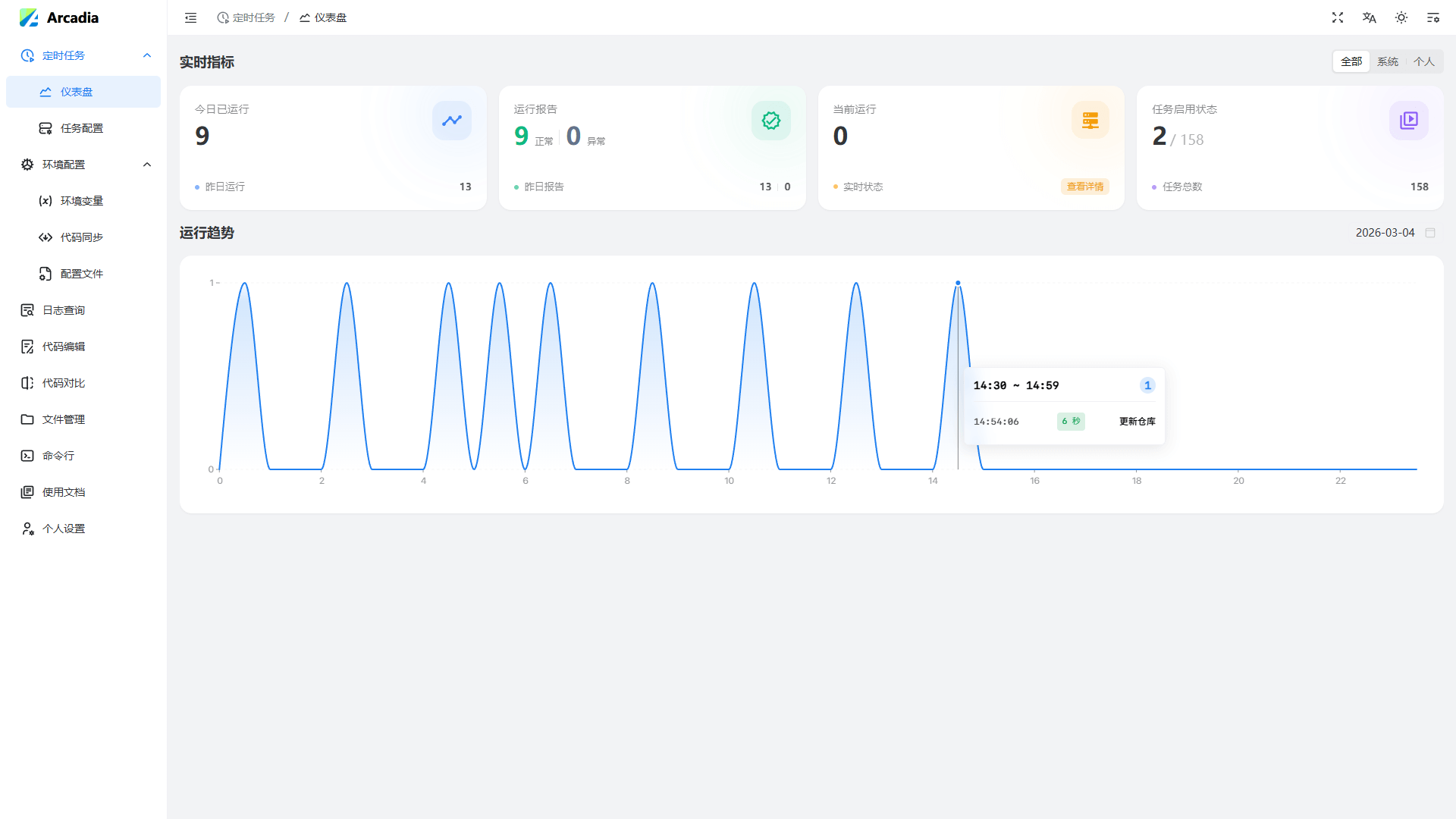 提供实时滚动、内容高亮、字体缩放、名称与日期范围过滤等能力,兼具反转输出与轮询刷新等高级模式,快速定位任意执行记录。